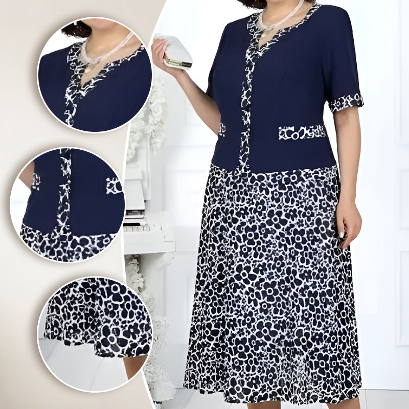 STÍLUSOS, KONTRASZT RÉSZLETEK: A ruha mély sötétkék felsőrésszel rendelkezik, amelyet virágmintás díszítés díszít az ujjakon, a zsebeken és a nyakkivágáson, amelyek gyönyörűen kiegészítik a mintás szoknyát, elegáns jelleget kölcsönözve az egésznek.