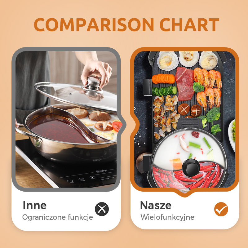 KÉTFÉLE FŐZÉSI MÓD – Élvezze a forró fazék és a grill tökéletes kombinációját egyetlen készülékben. Ez a megoldás megkönnyíti a családi vacsora vagy a baráti összejövetelek előkészítését, sokoldalú főzési módszert kínálva, amely helyet takarít meg és maximalizálja az ételek ízét. Nincs szükség a készülékek közötti váltásra – főzhet leveseket, grillezhet és készíthet más ételeket egy munkamenetben.