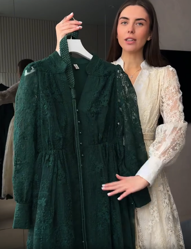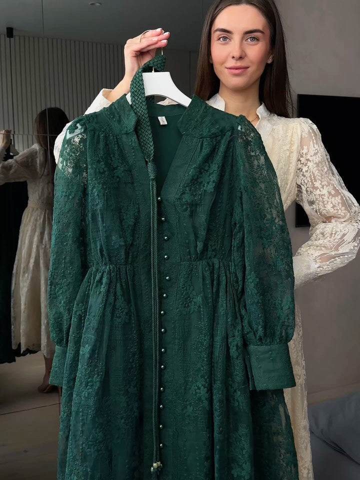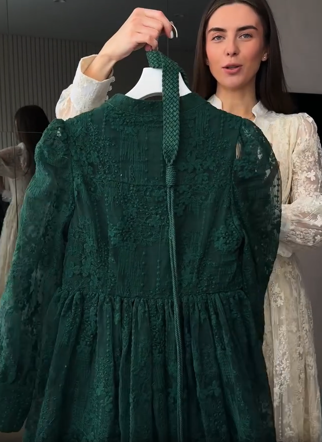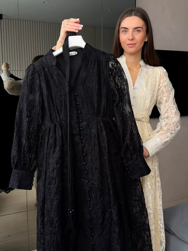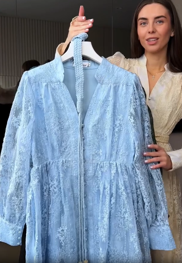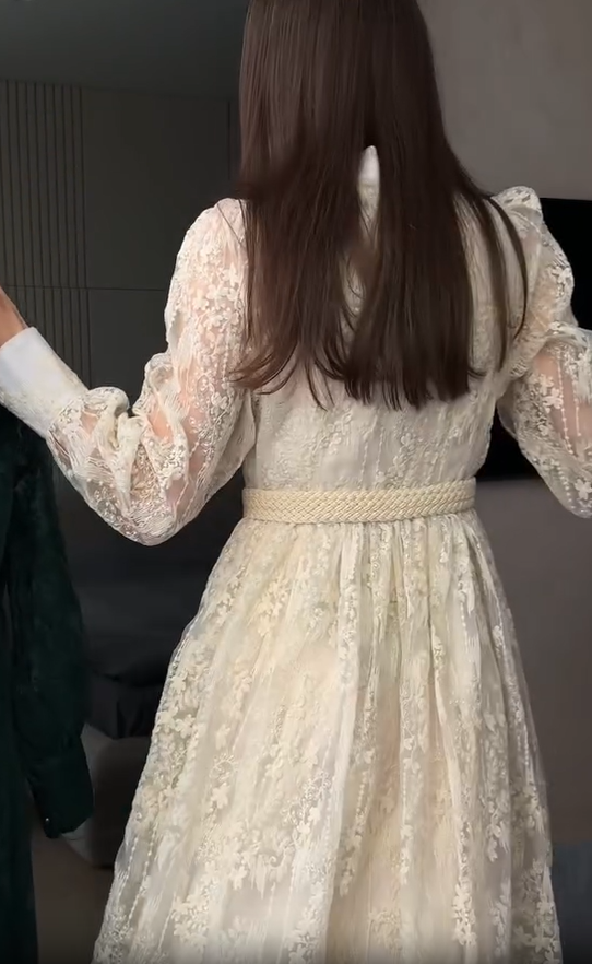 A részletekre való odafigyelés nyilvánvaló: a csipke kidolgozása, a finom és többrétegű minta, valamint a nyakkivágás és a mandzsetták kifinomult kidolgozása egy csipetnyi kifinomultságot kölcsönöz a ruhának.