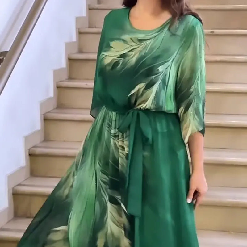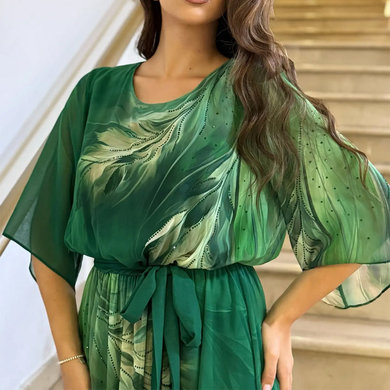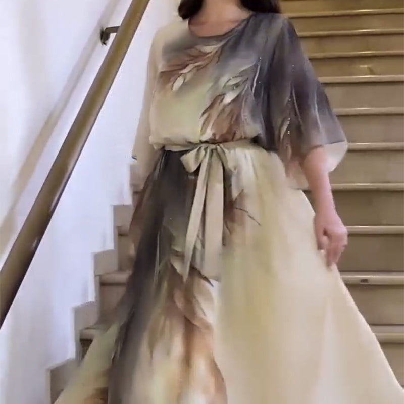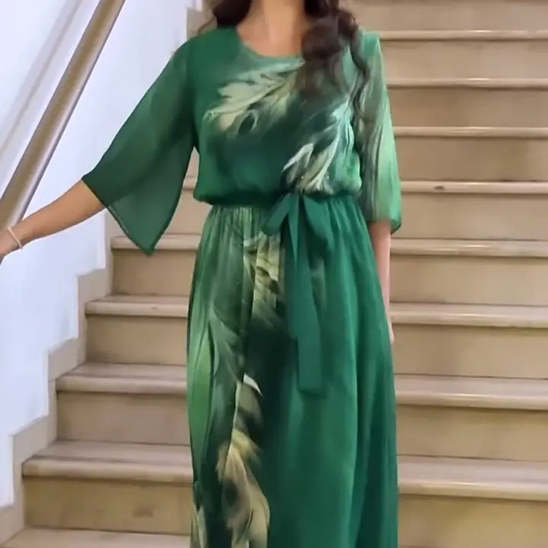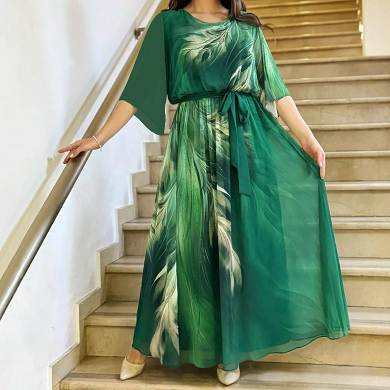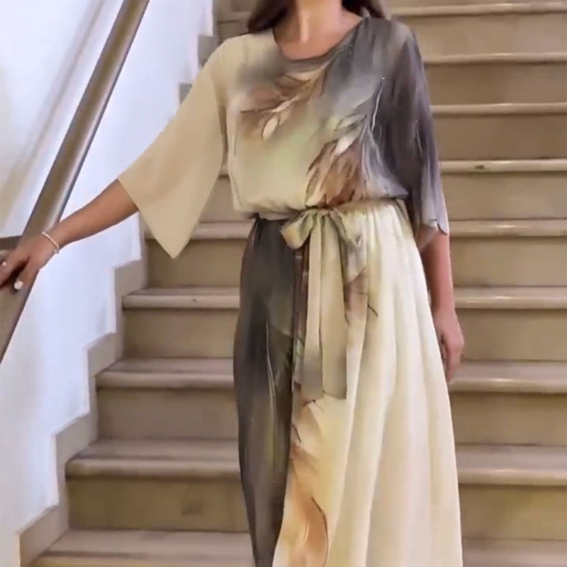 ELEGÁNS ÉS FOLYÉKONY KIVONAT – Ez a kereknyakú maxi ruha áramló sziluettjével és egyedi, szabálytalan mintájával kifinomult eleganciát kölcsönöz mind a hétköznapoknak, mind a formális alkalmaknak. A könnyű anyag egész napos kényelmet és stílust biztosít.