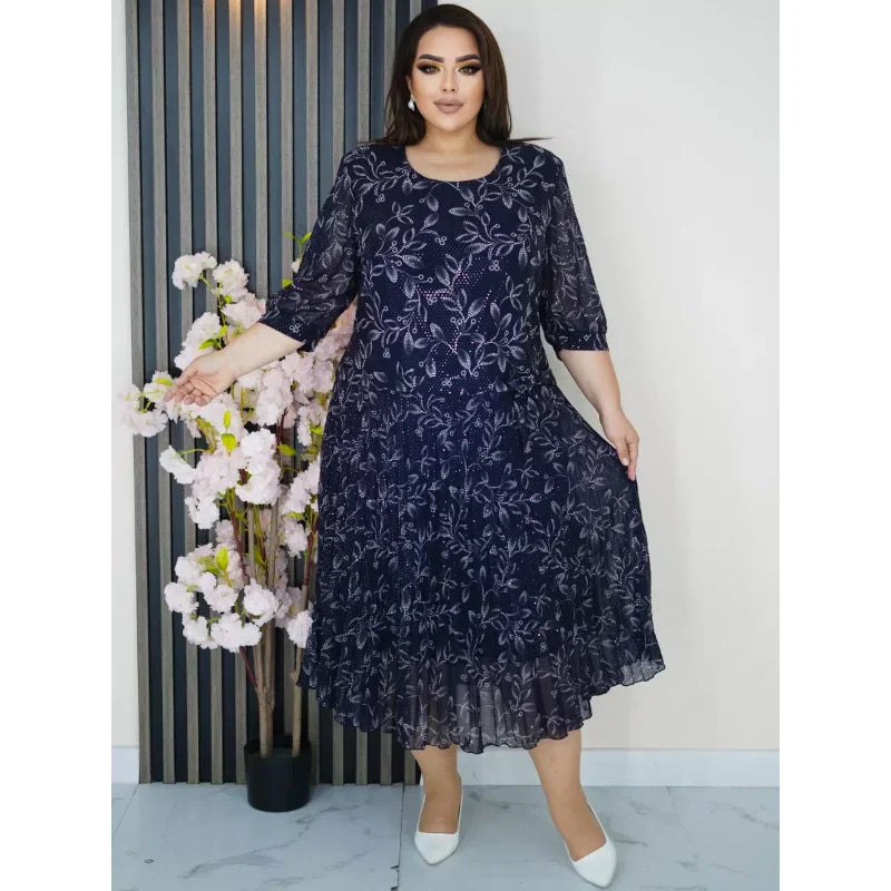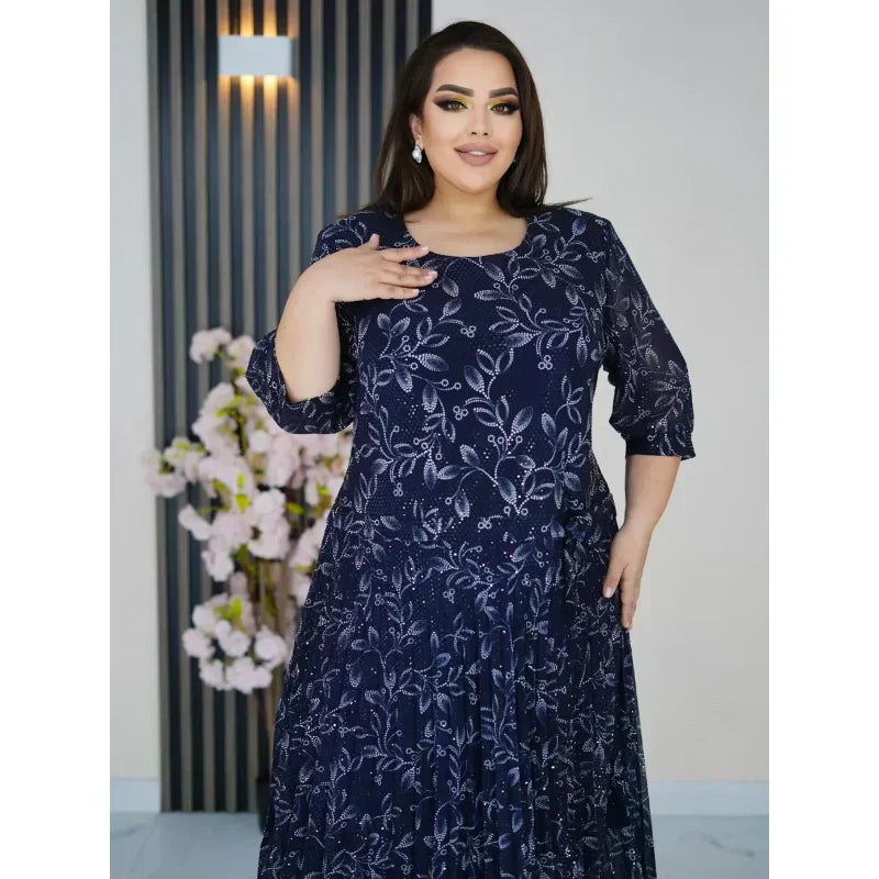 Kerek nyakú, 3/4-es ujjú, mintás maxi ruha